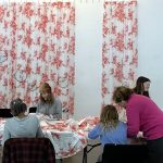 The floral curtain is a structure already coded, decorative, repetitive, domestic. The intervention does not erase that pattern. It misaligns it. Each portrait interrupts the surface. Each stitch displaces what was meant to remain invisible.